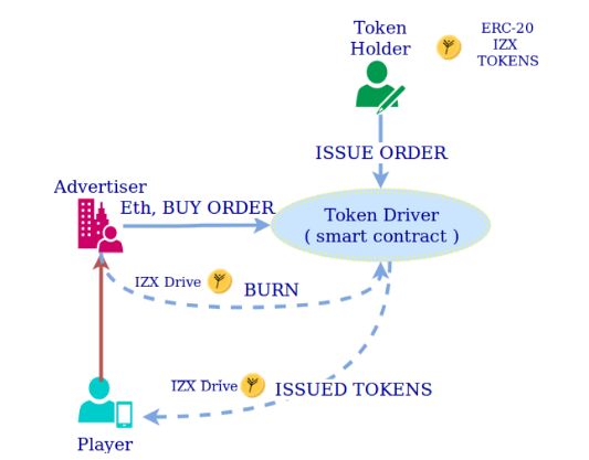 The token holder receives the order, issuance, and sale of the IZX ID token to the advertiser.