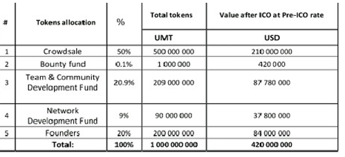 Start price of UMT token at Pre-ICO is expected to be 0.42 US Dollars.
